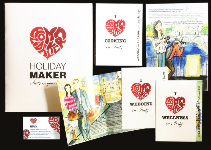 Logo, Immagine coordinata, Brochure , Flyers con disegni originali eseguiti a mano e tempera: “Shopping, Cookin, Photo Shooting, Wedding, Wellness”